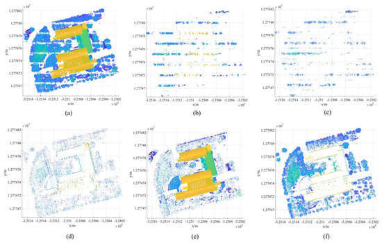 The feature extraction results of K-neighborhood and R-neighborhood of plot 1. (a) Characteristic of linearity of K-nearest neighbors; (b) Characteristic of planarity of K-nearest neighbors; (c) Characteristic of dispersion of K-nearest neighbors; (d) Characteristic of linearity of R-nearest neighbors; (e) Characteristic of planarity of R-nearest neighbors; (f) Characteristic of planarity of R-nearest neighbors.