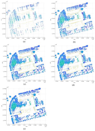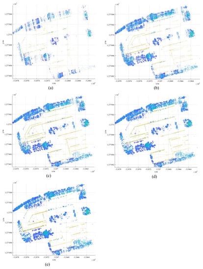 Vegetation extraction results at different R-neighborhood scales in plot 2. (a) R = 0.2 m; (b) R = 0.4 m; (c) R = 0.6 m; (d) R = 0.8 m; (e) R = 1 m.