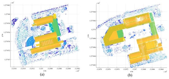 Building point cloud extracted results based on plane feature extraction. (a) Plot 1; (b) Plot 2.