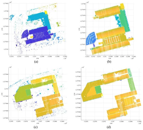 Accurate extraction results of the building point cloud. (a) Cluster result of plot 1; (b) Building extraction result of plot 1; (c) Cluster result of plot 2; (d) Building extraction result of plot 2.