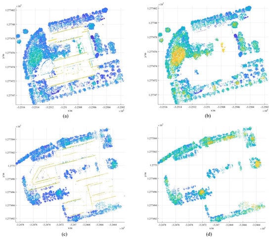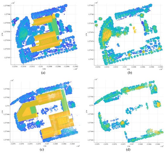 The results of the vegetation point clouds of the two plots after filtering out the building boundary point clouds. (a) Vegetation extracted using discrete feature of plot 1; (b) Result of filtering the building boundary of plot 1; (c) Vegetation extracted using discrete feature of plot 2; (d) Result of filtering the building boundary of plot 2.