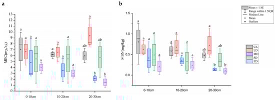 It can be seen in Figure 1, as trampling disturbance increased, MBC and MBN in the 0–10 cm soil layer showed a trend of first decreasing, then increasing, and then decreasing again. In both the 10–20 cm and 20–30 cm soil layers, the light disturbance (LD) treatment was higher than the other treatment groups in the same layer. In each soil layer, the extreme disturbance (ED) treatment was lower than the other treatment groups in the same layer. Specifically, in the 20–30 cm soil layer, MBC and MBN in the extreme disturbance treatment (ED) were significantly lower than those in the control group (CK) (p < 0.05).