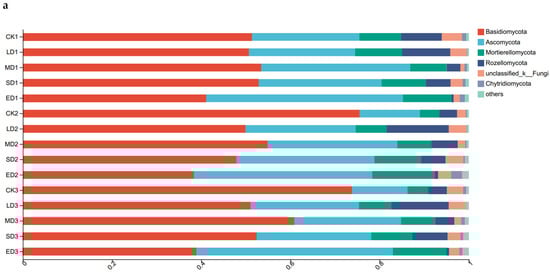 The fungal community composition at different trampling disturbances and soil depths was examined using column diagram analysis (Figure 2a). Basidiomycota and Ascomycota were the dominant groups of fungi in the soil, followed by Mortierellomycota and Rozellomycota. In all soil layers, Basidiomycota showed a clear decrease in relative abundance with increasing trampling intensity, while Ascomycota exhibited a clear increase. The relative abundance of Mortierellaomycota increased correspondingly. Rozellomycota displayed a trend of initially increasing and then decreasing, with the highest values in light disturbance (LD). Chytridiomycota exhibited the highest relative abundance under extreme disturbance (ED) in the 0–10 cm and 10–20 cm soil layers, but did not show a clear change at 20–30 cm. An increase of relative abundance in Basidiomycota was visible between CK1 and both CK2 and CK3, but not between CK2 and CK3. Moreover, Ascomycota exhibited the opposite behavior as it decreased, as can be seen in Figure 2. Soil depth did not exhibit regular changes in the other trampling treatments.