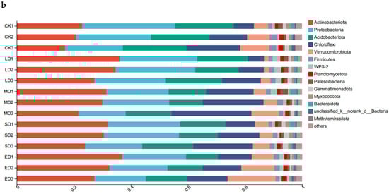 Based on the results of the column diagram analysis of the bacterial community, the composition of the community structure at the phylum level under different trampling disturbances and soil depths can be determined (Figure 2b). The samples soil contained four major bacterial groups, namely Chloroflexi, Actinobacteriota, Proteobacteria, and Acidobacteriota. There were similar trends of Actinobacteria in the 0–10 cm and 10–20 cm soil layers, showing an initial increase and subsequent decrease in response to different trampling disturbances, with the highest relative abundance in the light disturbance (LD). In contrast, the highest relative abundance in the 20–30 cm soil layer was observed in the extreme disturbance (ED) treatment. Proteobacteria showed no regular change, but extreme disturbance (ED) had lower relative abundance than CK. In all three soil layers, the relative abundance of Proteobacteria was clearly higher in extreme disturbance (ED), medium disturbance (MD), and severe disturbance (SD) treatments compared to the same soil layer of CK. Acidobacteriota showed no apparent change, with CK having a higher relative abundance than other trampling treatments.