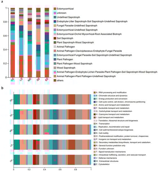 Functional groups inferred by FUNGuild classification of fungi (a), bacterial COG function classification (b) under different trampling disturbances. CK, LD, MD, SD and ED denote control, light disturbance, medium disturbance, severe disturbance and extreme disturbance, respectively.