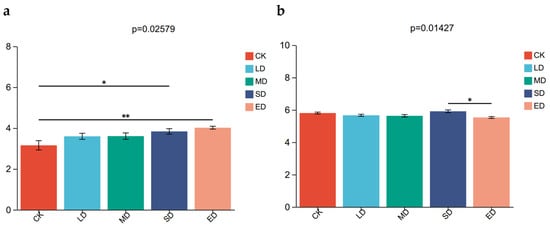Kruskal–Wallis H test for Shannon index of OTU level fungi (a), Kruskal–Wallis H test for Shannon index bacteria (b) under different trampling disturbances. * significant difference at p < 0.05; ** significant difference at p < 0.01. CK, LD, MD, SD, and ED denote control, light disturbance, medium disturbance, severe disturbance, and extreme disturbance, respectively.