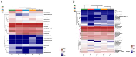 Heatmaps are usually clustered according to the similarity of abundance between samples, and the similarity and difference of community composition at the phylum level can be seen. Based on the provided Figure 6a, it is evident that, at the phylum level, the soil in the extreme disturbance (ED) exhibited the most significant (p < 0.05) variation in fungal species and abundance compared to other trampling treatments. A gradual change in fungal abundance and diversity was observed with an increase in trampling disturbance; however, a qualitative shift was detected after surpassing a certain threshold, which was observed when trampling disturbance reached extreme disturbance (ED). Sample clustering analysis revealed a far clustering relationship between extreme disturbance (ED) and CK as well as other treatment groups. Additionally, as illustrated in Figure 6b, at the phylum level, the sample clustering analysis demonstrated a far clustering relationship between each trampling treatment group and CK, indicating that each level of trampling can induce changes in bacterial species and abundance in soil, with a high degree of similarity between trampling levels.