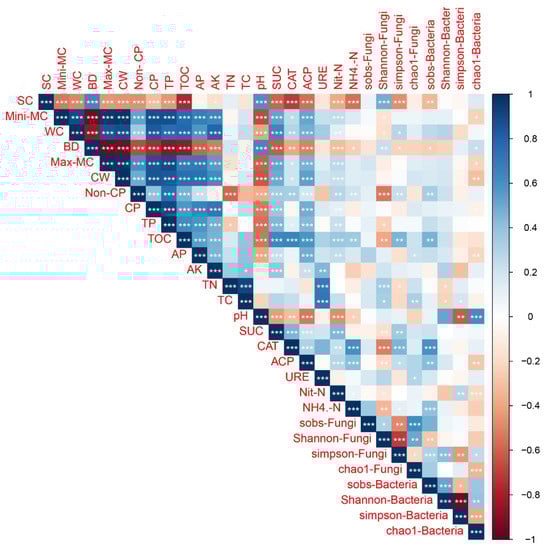 Pearson’s correlation coefficients between physicochemical properties and biological activity of soil. Significant correlations are marked in blue (positive) and red (negative). *** Significant difference at p < 0.001; ** significant difference at p < 0.01; * significant difference at p < 0.05. SC: Soil compaction; Mini-MC: Minimum moisture content; WC: Water content; BD: Bulk density; Max-MC: Maximum moisture content; CW: Capillary water; Non-CP: Non-capillary porosity; CP: Capillary porosity; TP: Total porosity; TOC: Organic carbon; AP: Available phosphorous; AK: Available K; TN: Total nitrogen; TC: Total carbon; pH; UC: Sucrase activity; CAT: Catalase activity; ACP: Acid phosphatase activity; URE: Urease activity; Nit-N: Nitrate nitrogen; NH4+-N: Ammonium nitrogen; Sobs-Fungi; Shannon-Fungi; Simpson-Fungi; Chao1-Fungi; Sobs-Bacteria; Shannon-Bacteria; Simpson-Bacteria; Chao1-Bacteria.