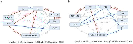 The standardization of total, direct and indirect effects of soil indexes on microorganisms under the influence of trampling was studied based on structural equation model (SEM), Shannon-Fungi (a), Chao1-Bacteria (b). *** Significant difference at p < 0.001; ** significant difference at p < 0.01; * significant difference at p < 0.05. The red and blue arrows represent significant negative and positive effects, respectively, while the gray dashed arrow represents no significant effect. The numbers next to the arrows are standardized path coefficients. SC: Soil compaction, BD: bulk density, Non-CP: Non-capillary porosity, NH4+-N: Ammonium nitrogen, TOC: Organic carbon, TN: total nitrogen, CAT: Catalase activity. CW: Capillary water, URE: Urease activity, ACP: Acid phosphatase activity, pH.