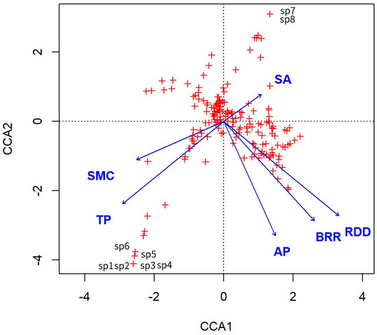 3.3.2. CCA Analysis of Plant Communities and Soil Factors