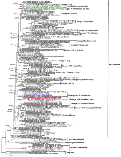 Although the diagnosis of sect. Ingratae is relatively straightforward, species within the section are difficult to distinguish. This is explained by the lack of molecular phylogenetic studies as well as morphological convergence documented in this group in previous studies [65]. With the wide application of molecular phylogenetic analyses, the diversity of species in sect. Ingratae was revealed in China (Figure 1). In order to delimit the phylogenetic species, we should pay much attention to the ornamentations of basidiospores, which are more reliable characters for species of sect. Ingratae. For example, basidiospores of R. clavulus, R. indocatillus, R. multilamellula, R. pseudocatillus, and R. subpunctipes are absent of reticula [9,12,14,15]; those of R. gelatinosa, R. hainanensis, R. pseudopectinatoides, R. punctipes, R. rufobasalis, R. straminella, and R. succinea often form incomplete reticulums; R. subpectinatoides has basidiospores with incomplete to complete reticula [9,11,12,16]. Moreover, five ornamentation types, viz., cone, cylinder, crest, ridge, and wing were observed; for example, basidiospores ornamentations of R. indocatillus and R. straminella mostly composed of conical warts [9], R. subpectinatoides mostly composed of long ridges [9], R. clavulus and R. multilamellula composed of cylindric warts and ridges [15], R. subpunctipes composed of cylindrical warts and wings [13], R. hainanensis composed of crests and ridges [16], R. pseudocatillus composed of conical to cylindrical warts [14], R. pseudopectinatoides composed of conical warts and ridges [11], R. succinea composed of crests and ridges [9], R. gelatinosa and R. punctipes composed of cylindrical warts, ridges and wings [12], R. rufobasalis composed of subcylindrical warts, crests and ridges [12]. In addition, the height of ornamentations is also a useful character: R. gelatinosa, R. punctipes, and R. subpunctipes have basidiospores with high ornamentations (>2 μm) [12,13]; that of R. clavulus, R. fujianensis, R. multilamellula, R. pseudocatillus, and R. succinea is moderately high (1–2 μm) [9,14,15]; while that of R. hainanensis, R. indocatillus, R. oraria, R. pseudopectinatoides, R. rufobasalis, R. straminella, and R. subpectinatoides is low (<1 μm) [9,11,12,16]. As to our new species, viz., R. fujianensis and R. oraria are absent of reticula; R. oraria is mostly composed of cylindric warts, while R. fujianensis is composed of cylindrical warts and wings.