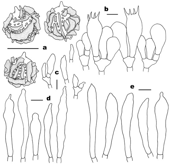 Microscopic features of Russula oraria (FHMU5355, holotype). (a) Basidiospores. (b) Basidia and basidiola. (c) Marginal cells. (d) Pleurocystidia. (e) Cheilocystidia. Bars: 10 μm. Drawings by Y.X. Han.