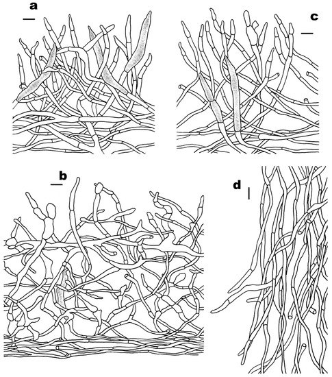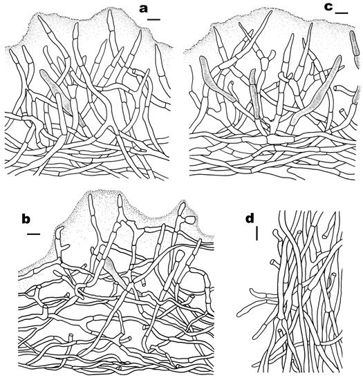Microscopic features of Russula oraria (FHMU5355, holotype). (a) Pileipellis at pileus margin. (b) Pileipellis at middle part between center and margin of pileus. (c) Pileipellis at pileus centre. (d) Stipitipellis. Bars: 10 μm. Drawings by Y.X. Han.
