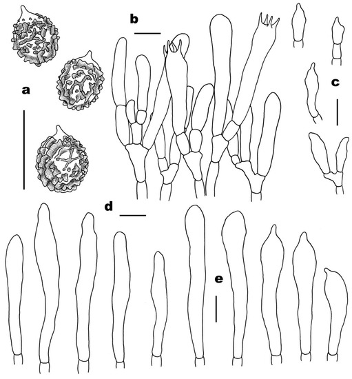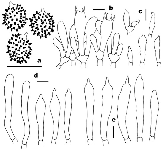Microscopic features of Russula rufobasalis (FHMU827). (a) Basidiospores. (b) Basidia and basidiola. (c) Marginal cells. (d) Pleurocystidia. (e) Cheilocystidia. Bars: 10 μm. Drawings by Y.X. Han.