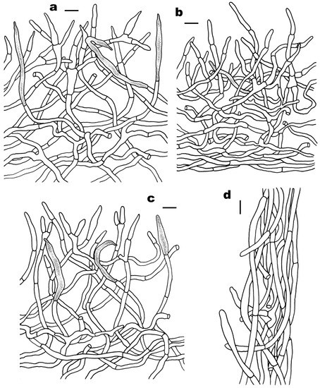 Microscopic features of Russula rufobasalis (FHMU827). (a) Pileipellis at pileus centre. (b) Pileipellis at middle part between center and margin of pileus. (c) Pileipellis at pileus margin. (d) Stipitipellis. Bars: 10 μm. Drawings by Y.X. Han.