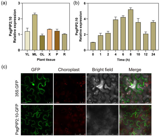 3.2. Expression Pattern of PagPIP2;10 in Different Tissue and in Response to Osmotic Stress