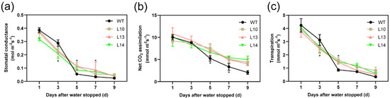 3.4. Overexpression of PagPIP2;10 Enhanced Tolerances to Drought Stress