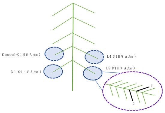 In April 2021, one of the two 20–30 cm branchlets was cut from all treatments and controls and taken to the lab for evaluation. During this time, HWA sistens had produced most of their eggs and L. nigrinus larvae were present. Branches were placed in water saturated Instant Deluxe Floral Foam (Smithers-Oasis North America, Kent, OH) wrapped in Parafilm M (Beemis N.A., Neemah, WI, USA). Each branch was placed on a sheet of metal grating which sat on the lid of a 118 mL Verones mason canning jar. Grafix 0.0127 cm Clear Dura-Lar Film (Grafix, Maple Heights, OH) was then cut 25 cm tall and taped as an open-ended cylinder to the width of the mason jar lid, creating a plastic covering surrounding the branch. This construction represents a smaller version of the L. nigrinus rearing funnels used by Salom et al., 2012 [36]. Funnels holding the branches were labeled and placed into an environmental chamber set at 13 °C with a photoperiod of 12L:12D. Mason jars were checked daily for L. nigrinus larvae until larval drop ceased for five consecutive days. Laricobius nigrinus larvae were collected and recorded for each branch. Any negative control and NL branches found with L. nigrinus larvae were removed from the study. In Blacksburg, VA, a study concluded that all Laricobius spp. larvae collected within the area were 98% L. nigrinus and 2% Laricobius rubidus LeConte (Coleoptera: Derodontidae) [28]. Therefore, we assume the percentage of Laricobius spp. larvae collected from treatment branches to be similar with the majority of larvae being L. nigrinus.