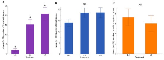 Several studies have utilized HWA sistens ovisac disturbance to assess the impact of L. nigrinus on HWA populations in the eastern US [11,30,31,32,39]. In our study, L. nigrinus predation produced a significantly greater number of disturbed ovisacs compared to the NL treatment, which did not contain L. nigrinus adults (Figure 2A). This supports the findings of Jubb et al., 2020 [31] and Mayfield et al., 2015 [32], where exclusion cages were used at sites where L. nigrinus was established.