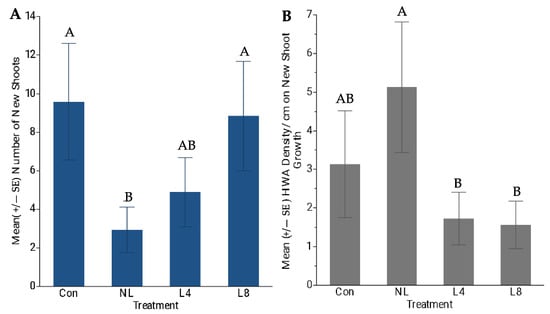 Experiment 2––External Tree Measurements. (A) Mean (+/− SE) number of new shoots across treatments. Different letters above standard error bars indicate significant (p < 0.05) differences, Tukey post hoc adjustment. (B) Mean (+/− SE) HWA density (HWA/cm) on new shoot growth across treatments. Different letters above standard error bars indicate significant (p < 0.05) differences, Tukey post hoc adjustment. All measurements were taken on eastern hemlock. Con = no predators at low HWA densities (<1/cm), NL = no predators at moderate to high HWA densities (<1 HWA/cm), L4 = 4 and L8 = 8 L. nigrinus at moderate to high HWA densities.