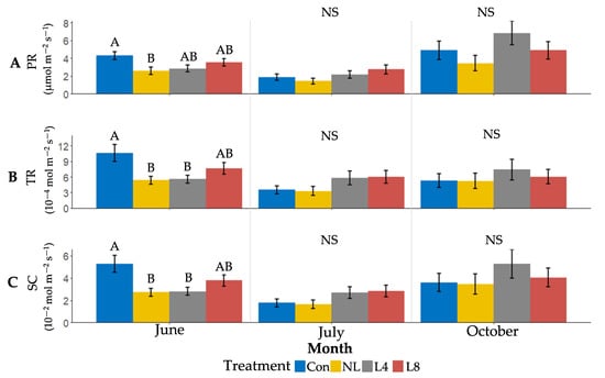 Experiment 2—Tree Physiological Measurements. (A) Model adjusted mean (+/− SE) photosynthetic rate (PR) across treatments for June, July, and October. Different letters above standard error bars indicate significant (p < 0.05) differences, Tukey post hoc adjustment. Statistical analyses are separated by month. (B) Model adjusted mean (+/− SE) transpiration rate (TR) across treatments and separated by month. Letters NS above standard error bars indicate no significant (p < 0.05) differences. Statistical analyses are separated by month. Units were converted to 10−4 for easier viewing. (C) Model adjusted mean (+/− SE) stomatal conductance (SC) across treatments for June, July, and October. Units for stomatal conductance were converted to 10—2 for easier viewing. Letters NS above standard error bars indicate no significant (p < 0.05) differences. Statistical analyses are separated by month. All measurements were taken on eastern hemlock. Con = no predators at low HWA densities (<1/cm), NL = no predators at moderate to high HWA densities (<1 HWA/cm), L4 = 4 and L8 = 8 L. nigrinus at moderate to high HWA densities.