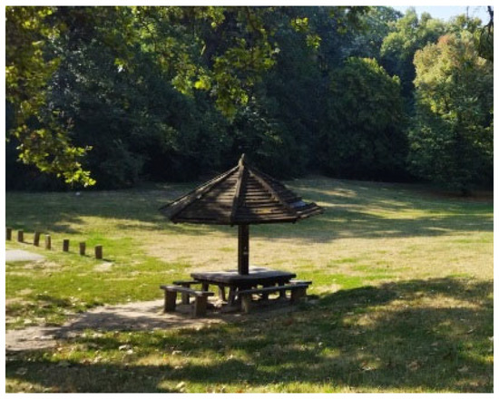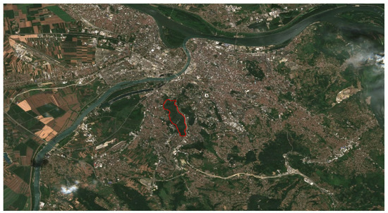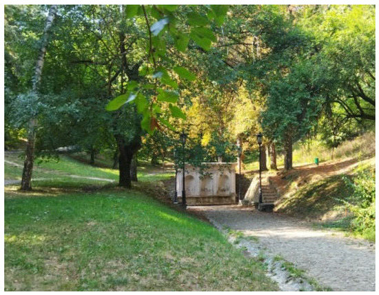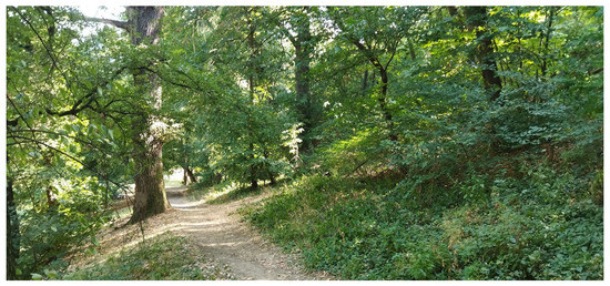 Due to its exceptional natural and cultural–historical values, the forest “Košutnjak” was declared a cultural heritage of exceptional importance for Serbia by the Institute for the Protection of Cultural Monuments of Serbia (IPCMS). Due to its favorable geographical position, climatic and geomorphological characteristics, and richness of flora and fauna (INCS), it was declared a natural monument. Based on the criteria, condition, and potential of the forests and wooded areas in MU “Košutnjak”, the following priority functions have been defined: first degree soil protection; first degree tourist recreation centre (Figure 3); strict nature reserve. The primaeval forest of English oak and hornbeam near the “Hajduk drinking fountain” (Figure 4) in Košutnjak was declared a strict nature reserve. On the satellite image Kosutnjak can be seen as an isolated island of vegetation within the built-up urban area (Figure 5).
