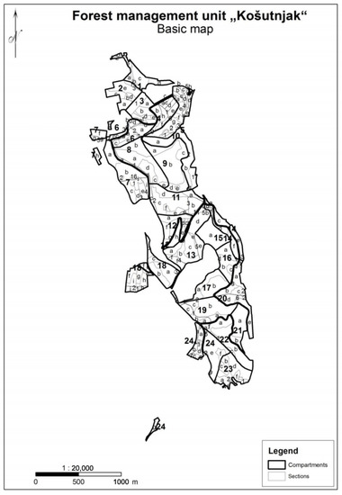 Map of stability in the Košutnjak forest. Numbers—Forest department, Letters—Department subdivision.