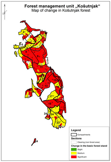 Figure 9 shows the change in the basic forest type. It can be seen that the forest is significantly altered (red) on 63.09% of the area, mainly in the central parts of the forest, while it is moderately altered (yellow) on 36.91%, mainly in the southern parts of the forest. There are no parts that are not affected by changes (green): 0%.