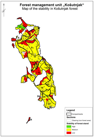 Our research results indicate that the changes in plant composition have a negative impact on stand stability, thus reducing the self-regeneration capacity of the studied forest complex. The research also confirmed the original assumption that the stability of the forest complex “Košutnjak” was reduced due to the significant changes in the stands (observed on 56.81% of the section area) and was classified as medium on 66.66% of the section area (Table 3), while the self-regeneration capacity of most sections (59.84%) was low—insufficient in terms of sustainability.