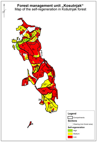 Map of self-regeneration capacity in the Košutnjak forest. Numbers—Forest department, Letters—Department subdivision.