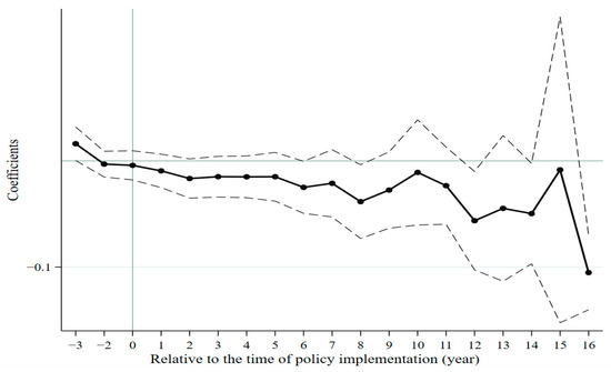 (2) Replace the low haze measurement indicator. In order to avoid the bias of the results caused by the way the explanatory variables are measured, this paper used PM10 and industrial sulfur dioxide removal as proxies to re-run the robustness test, and the results are shown in columns (3)–(4) in Table 3. It was found that the NFCP has had a significant negative effect on urban PM10 and a significant positive effect on industrial sulfur dioxide removal, indicating that NFCP significantly reduces urban PM10 concentration and has a positive effect on urban industrial sulfur dioxide removal, which also indicates the robustness of the baseline regression results.