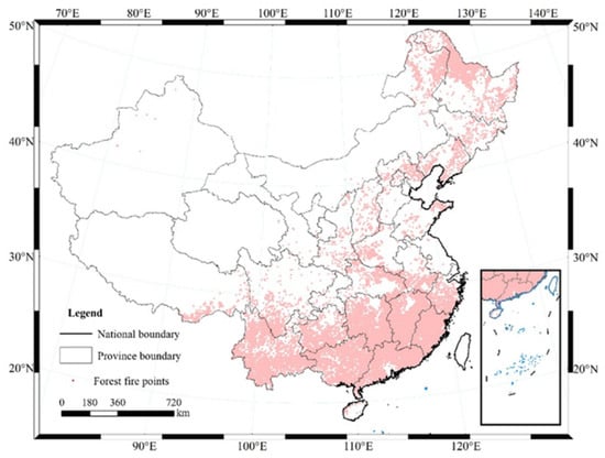 China encompasses multiple climatic zones, ranging from tropical to subtropical and temperate, exhibiting a complex and diverse spectrum of climates with pronounced north–south variations. Its topography is characterized by highlands and plateaus in the west and comparatively lower regions in the east, with an abundance of mountains, hills, and other geographic entities [14]. Dense woodlands are situated in the mountainous parts of the southeastern and southwestern regions, and there is a vast expanse of desert in the northwestern region [15]. In comparison with developed countries with well-established forestry industries, China has a comparatively lower-quality of forest resource and a geographically imbalanced regional distribution. China is still a country with insufficient forest coverage and a relatively fragile ecological environment. As shown in Figure 1, we selected 121,691 forest fire points.
