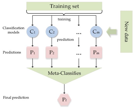 The prediction of the jth base model for the ith training sample is used as the jth feature value for the ith sample in the new training set, and final training is based on the new training set. Similarly, the prediction process goes through the predictions of all the base models to form a new test set, and finally, the predictions are made on the test set. The base models (base classifiers) used are RF, GBDT, SVM, and the target classifier is logistic regression, as shown in Figure 3.