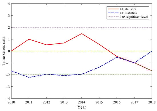 where represents the expected value, the variance represents the variance, and the is a typical normal distribution. That is, the statistical order is derived from the time series order , the statistics sequence by time series reverse is calculated, the above process is repeated, and is calculated. If the UF or UB value is greater than 0, the time series is up and down; when these values are above or below the critical line (significance level line), it is obviously up or down, and the range beyond the critical line is determined as the mutation time region of the critical line [20].