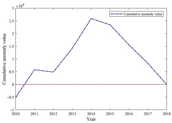 Figure 5 presents a cumulative anomaly curve of forest fire points in China from 2010 to 2018. This curve indicates the total number of anomalies for each year. For 2017, a significant alteration in the cumulative-distance leveling curve (illustrated in Figure 5) is observed. The intersection of UF and UB within the confidence line at this point confirms that it is a viable point to identify a dramatic transformation in the number of national hotspots from 2010 to 2018.