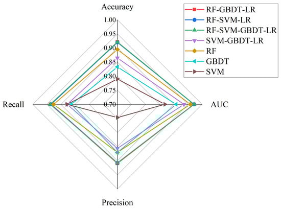 The effectiveness of the individual machine-learning models and the hybrid models was validated using accuracy, AUC, precision, and recall metrics. According to the validation results (shown in Figure 7), the higher accuracy values indicate that the models have better predictions for positive samples, and the order of the accuracy values for these models is LR-RF-SVM-GBDT > LR-RF-GBDT > LR-RF-SVM > RF > GBDT > SVM, with SVM performing the worst. LR-RF-SVM-GBDT performed best, with accuracy of 92.10%, precision of 90.80%, AUC of 97.17%, and recall of 93.77%; LR-RF-GBDT performed second only to LR-RF-SVM-GBDT, with accuracy of 92.14%, precision of 90.90%, AUC of 97.12%, and recall of 93.66%; and SVM performed the worst, with accuracy of 78.97%, precision of 74.67%, AUC of 86.81%, and recall of 87.88%. In this study, the number of GBDT weak learners was set to 100, the learning rate was 0.1, the number of RF decision trees was set to 50, and the SVM kernel function selected was RBF 3.4.