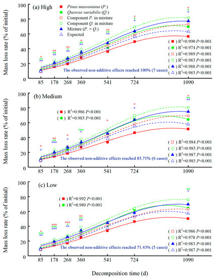 Compared with the MLR of the litter mixtures, the corresponding expected MLR was always lower (significantly lower during the first year regardless of soil nutrient substrate and in the second and third year for high soil nutrient substrate). There were 100%, 85.71%, and 71.43% observed incidence of non-additive MLR during the experiment period in the high, medium, and low conditions of the soil nutrient substrate, respectively.