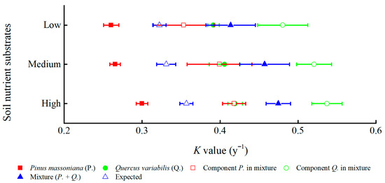 Similarly, over the experiment period, the decomposition constant (k value) showed a significant difference among the leaf litter type and soil conditions (Figure 2). The litter k value of P. massoniana was always lower than that of Q. variabilis, regardless of the treatments of soil nutrient substrate and whether the comparison was of the single or among the components in the mixture (p < 0.01 to 0.001 for the three single cases; p = 0.008 to >0.05 for the three component cases, which was only significant in the treatment with a high soil nutrient substrate). In addition, the k value of the mixture was always larger than that of the two single litter types, regardless of the soil nutrient substrate (significance: p < 0.05, except for the two cases in the medium and low soil nutrient substrate for the comparison between the mixture and single litter of Q. variabilis). Compared with the excepted k value, the corresponding observed value in the three soil nutrient substrate treatments was significantly larger (significance: p < 0.05, except for the case in low soil nutrient substrate, which was equal to 0.05).