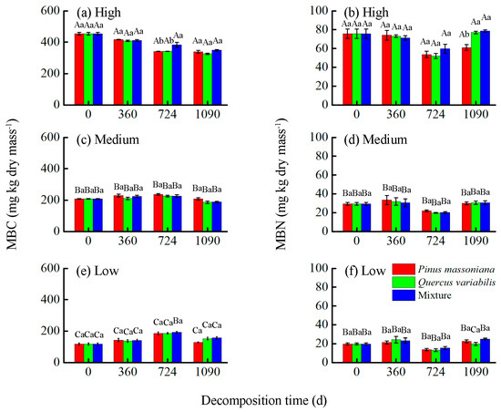 Dynamic of soil microbial biomass for carbon (a,c,e) and microbial biomass nitrogen (b,d,f) among the litter types in different soil nutrient substrates during decomposition. Values are the mean ± SE (n = 3). Different capital letters indicate a significant difference among soil substrates for the same litter type at the same decomposition time; different lowercase letters indicate a significant difference among litter types for the same soil substrate at the same decomposition time (p < 0.05).