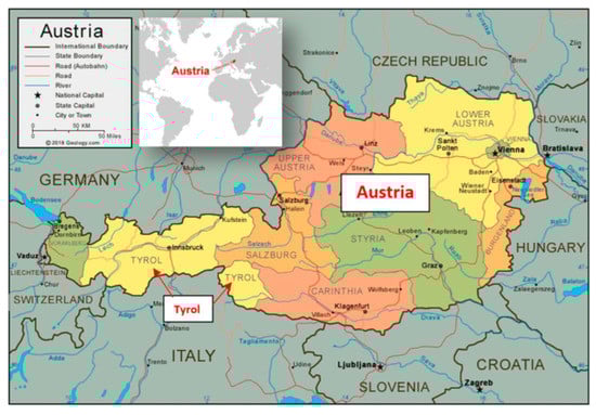 Study area. Maps of the study area Tyrol, which is located in Austria (47°41′47.30″ N, 13°20′44.64″ E), Central Europe. The map was taken from https://geology.com/world/austria-satellite-image.shtml (accessed 6 March 2023).
