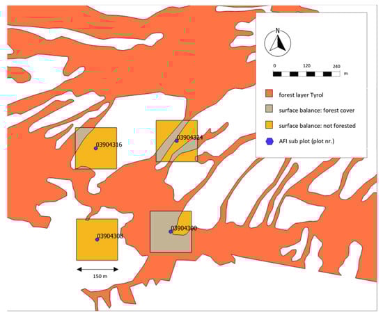 Assessment of surface balance (47°15′34.7724″ N, 11°24′1.3500″ E). Squares with side length 150 m are used to compute surface balance around AFI subplots (e.g., plot nr. 03904308) between forest (light orange polygons) and non-forest area (grey polygons) in QGIS.