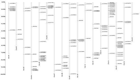 The rubber tree genome was searching for genes containing MYB or MYB-like domains using HMMER 3.1. After being confirmed by SMART and Pfam, a total of 132 unique R2R3-MYB family genes were identified in the rubber tree (Table S2). All the HbR2R3-MYBs were unevenly distributed across the 17 rubber tree chromosomes, except for KAF2283161.1, KAF2282816.1, KAF2282567.1, and KAF2282578.1. The largest number of HbMYB genes were mapped to chromosome 15 (Chr15), followed by Chr14 (14), and Chr05 (15). Interestingly, only one HbMYB was mapped to Chr17 and none to Chr18 (Figure 1, Supplement Table S1). To further understand the molecular characteristics of the HbMYB genes, a physicochemical properties analysis was performed. The amino acids (aa) length of HbMYB encoded proteins ranges from 110 to 1014 with isoelectric points range from 4.78 to 10.14, and theoretical molecular weight range from 12.65 kDa to 113.83 kDa, respectively (Table S2).