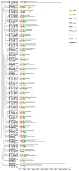 To investigate the systematics evolution and sequence features of the HbR2R3-MYB proteins, a phylogenetic tree and motif composition analysis were performed. As showed in Figure 2, nine conserved motifs were identified in these proteins by MEME analysis. Almost all HbR2R3-MYBs contains motif 1, 2, 3, and 4, which were part of the R2 or R3 (Figure 2). About half of the HbR2R3-MYB proteins contains motif 6 which did not belong to the conserved R2 or R3 domain. Motif 8 was present in five genes (KAF2309955.1, KAF2303530.1, KAF2303547.1, KAF2315415.1, and KAF2282816.1), while motif 5 was only present in one gene (KAF2288602.1). Additionally, motif 9 was present in all members of S9 and two genes (KAF2289285.1and KAF2313600.1) did not divide into any subgroups. Moti 7 existed simultaneously in 44 members of HbR2R3-MYBs from S4, S9, S11 S13, and S24. These conserved motifs may be associated with the specific biological functions of the different subgroups proteins.