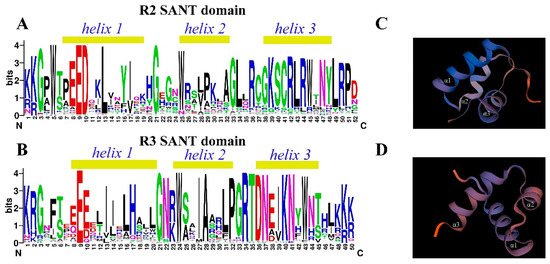 Domains of HbR2R3-MYBs and 3D structure models of R2 and R3 MYB repeats. Sequence logos of R2 domain (A) and R3 domain (B). The bit score indicates the information content for each position in the sequence and the light yellow box above the sequence indicate the HTH structure. Predicted 3D structure models of the R2 (C) and R3 domains (D). The 3D structure of the R2 and R3 repeats domains was constructed using AtMYB66 (PDB: 6kks) as a template.