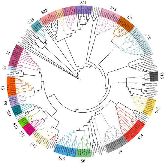 To infer the evolutionary relationship of the rubber tree R2R3-MYB family, the 132 rubber tree HbR2R3-MYBs, and the Arabidopsis AtMYB family members were clustered by using MEGA 11 and a phylogenetic tree was constructed (Figure 4). Based on the results and previous studies on the Arabidopsis AtMYB family, 132 HbR2R3-MYBs were divided into 20 subgroups (S1, S2, S3, S4, S6, S7, S9, S10, S11, S12, S13, S14, S15, S16, S18, S20, S21, S22, S24, and S25). Among the subgroups, the majority of R2R3-MYB members were found in the S2 and S15, each containing nine members, followed by S4 which consisted of eight members. In addition, two MYB subgroups (S3, and S25) did not exhibit any rubber tree HbR2R3-MYBs.
