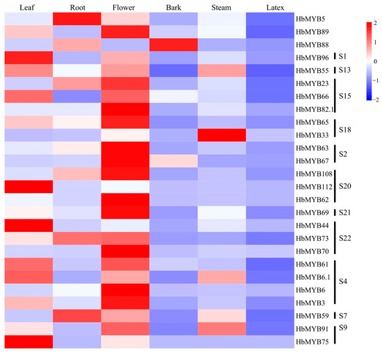 Tissue expression profiles of HbR2R3-MYBs in different tissues. The color bar represents the gene expression level, with red indicating high expression level, white indicating no expression, and blue indicating low expression level of transcript abundance (the same in Figure 6 and Figure 7).