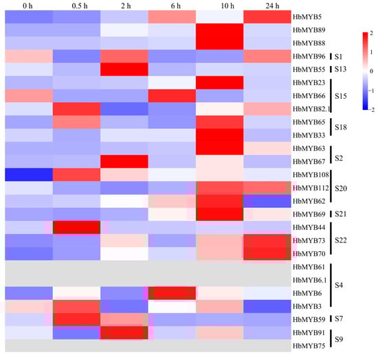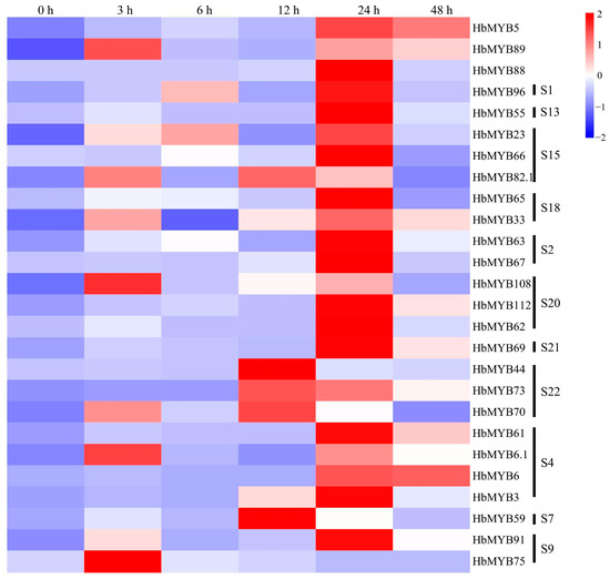 Figure 7 and Table S4 shows that there were four genes with significant differences in expression after ETH treatment, whose expression was 35–250 times higher than at 0 h. The expression of the HbMYB63 gene at 6 h was 19 times higher than that at 0 h, and its expression level was increased significantly at 10 h, to 272 times that at 0 h. At 24 h, HbMYB63 expression decreased, but it was still 94 times higher than that at 0 h (Figure 7, Table S4). The expression level of the HbMYB23 gene at 10 h was 37 times higher than that at 0 h, and the expression level of the HbMYB44 gene was significantly increased at 0.5 h to 42 times that at 0 h, after which it decreased significantly to a level close to that at 0 h (Figure 7, Table S4). The expression of the HbMYB69 gene increased significantly beginning at 6 h and peaked at 10 h, when it was 55 times higher than that at 0 h (Figure 7, Table S4).