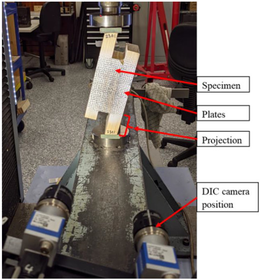 Sample displacements were measured at various points using a Digital Image Correlation (DIC) system (Figure 1), which used USB cameras (Basler Ace USB 3.0 Camera) at a pre-defined distance from the target sample. The cameras were configured with 17 mm lenses and a frame rate of 0.5 s and set at a distance of approximately 0.5 m from the samples. This allowed for an appropriate test area to be established between the sample and the cameras while achieving accurate image data from the tests. The samples were first painted with a speckle pattern to give a random display of black and white contrast in the images captured by the DIC system. The system then applied an appropriately sized grid over the sample surface and tracked each individual grid square and the corresponding pixel displacement during the test. Using a pair of virtual deflection gauges positioned on either face of the test board, a virtual extensometer was created as presented in [4]. Based on the virtual extensometer information extracted from the test, displacement in millimetres resolved into the relevant movement axes can be accurately obtained using DIC techniques for RS calculations. Mechanical testing of the RS specimens was conducted using a Shimadzu universal testing machine (AG-100X, Shimadzu Corporation, Kyoto, Japan) with a 100 kN load cell fitted. The loading speed was 1.5 mm/min to ensure sufficient image data were collected prior to failure.