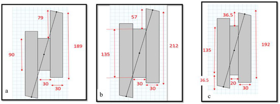 Sixty samples in total were manufactured with a target MOE of 10,000 MPa to evaluate the effect of aspect ratio. Three aspect ratios of boards were tested with dimensions of 90 mm × 30 mm, 135 mm × 30 mm and 135 mm × 20 mm, resulting in aspect ratio of 3, 4.5 and 6.75, respectively. To achieve considered aspect ratios, adjustments on the projection length of the plates were made to ensure that the load could pass through the centre of the sample with a vertical load path whilst maintaining a constant specimen angle. Sample configurations for the selected aspect ratios are shown in Figure 2.