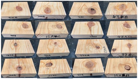 Following the investigations on species, same sized samples (cross section of 135 × 30 mm and a 56.6 mm projection length, target MOE of 10,000 MPa) but with sound centered knots (Figure 3) were carefully selected for 3 species to investigate the effects of knottiness. A total number of 45 knot samples including 15 for each species were tested.